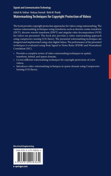 The book provides copyright protection approaches for videos using watermarking. The various watermarking techniques using various transforms such as discrete cosine transform (DCT), discrete wavelet transform (DWT) and singular value decomposition (SVD) for videos are presented. The book also provides video watermarking approach using compressive sensing (CS) theory. The presented watermarking techniques are designed and implemented using color digital videos. The performance of the presented techniques is evaluated using Peak Signal to Noise Ratio (PSNR) and Normalized Correlation (NC).