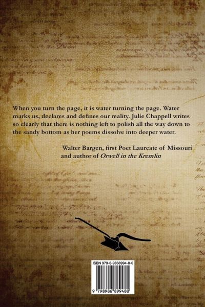 When you turn the page, it is water turning the page. How water marks the reaches of who we are, as the book binds our thoughts and aspirations. Water binds us together, as you watch your fingers joyously swim through these poems, waiting for the current to rejoin us, to recall where we hoped to reside, and wait for all that you once hoped was possible. Water marks us, declares and defines our reality, a ghostly image that can be seen on both sides of the billion dinar bill that I hold up to the light to see the watery image that has little value from a country that no longer exists. Julie Chappell writes so clearly that there is nothing left to polish all the way down to the sandy bottom as her poems dissolve into deeper water. Walter Bargen, First Poet Laureate of Missouri, and author of Orwell in the Kremlin