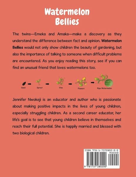 Emeka and Amaka discover a new liking for gardening and take it seriously. Gardening teaches them patience, responsibility, thoughtfulness, and the love for nature. Watermelon Bellies dispels the myth about plants growing in bellies. The colorful illustrations tell the story to early readers, and the uncolored illustrations can be used for extended activities. As you enjoy reading the story, try and find an unusual friend that loves watermelons too.
