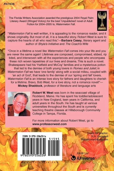 Winner of the Florida Writers Association 2004 Royal Palm Literary Award for the best unpublished novel of adult fiction for 2004-2005 'Watermelon Fall is well written, it is appealing to the romance reader, and it shows originality. But most of all, it is a beautiful story. Robert West is sure to capture the hearts of all who read this."-Barbara Casey, literary agent and author of Shyla's Initiative and The Coach's Wife 'Once in a lifetime a novel like Watermelon Fall comes into your life and you are never the same again! Lifetimes are composed, compromised, ebbed, rip tided, and interwoven with all the experiences and people who encompass these rich woven tapestries of our lives and dreams. This is such a novel. Shakespeare had his 'Hatfield and McCoy' families and a mysterious potion that led to the demise of both young lovers in Romeo and Juliet; in Watermelon Fall we have 'one family' along with a social milieu, coupled with 'an act of God', that leads to the demise of our 'spring and fall' lovers. Watermelon Fall is an intense love story for fathers and daughters to cherish for a lifetime. Bravo, Bob West, for a love story, not a romance novel!"-Mickey Shaddock, professor of literature and language arts