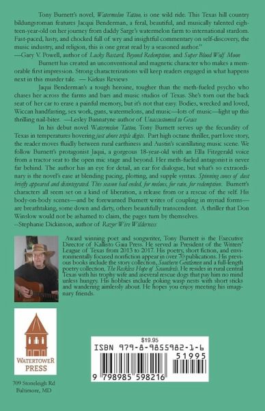 Jaqui's a tough heroine, tougher than the meth-fueled menace, gritty music business, corruption, and betrayal that close in on her. Hair-raising, unafraid, and ever-unpredictable, Tony Burnett's Watermelon Tattoo is part psycho thriller, part love story, told with the heart-stopping speed of a runaway train.