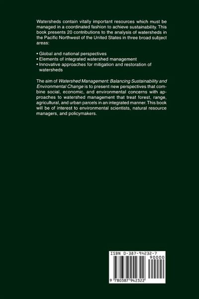 1. Global and National Perspectives.- 1. New Perspectives for Watershed Management: Balancing Long-Term Sustainability with Cumulative Environmental Change.- 2. Impacts on Ecosystems of Global Environmental Changes in Pacific Northwest Watersheds.- 3. Scientific Basis for New Perspectives in Forests and Streams.- 4. Ecologically Effective Social Organization as a Requirement for Sustaining Watershed Ecosystems.- 5. Management of Aquatic Resources in Large Catchments: Recognizing Interactions Between Ecosystem Connectivity and Environmental Disturbance.- 2. Elements of Integrated Watershed Management.- 6. Fundamental Elements of Ecologically Healthy Watersheds in the Pacific Northwest Coastal Ecoregion.- 7. Best Management Practices, Cumulative Effects, and Long-Term Trends in Fish Abundance in Pacific Northwest River Systems.- 8. Sensitivity of the Regional Water Balance in the Columbia River Basin to Climate Variability: Application of a Spatially Distributed Water Balance Model.- 9. Impacts of Watershed Management on Land-Margin Ecosystems: The Columbia River Estuary.- 10. Some Emerging Issues in Watershed Management: Landscape Patterns, Species Conservation, and Climate Change.- 11. Using Simulation Models and Geographic Information Systems to Integrate Ecosystem and Landscape Ecology.- 12. Consideration of Watersheds in Long-Term Forest Planning Models: The Case of FORPLAN and Its Use on the National Forests.- 13. Integrating Management Tools, Ecological Knowledge, and Silviculture.- 3. Innovative Approaches for Mitigation and Restoration of Watersheds.- 14. The Science and Politics of BMPs in Forestry: California Experiences.- 15. Best Management Practices and Cumulative Effects from Sedimentation in the South Fork Salmon River: An Idaho Case Study.- 16. Managementfor Water Quality on Rangelands Through Best Management Practices: The Idaho Approach.- 17. Riparian Responses to Grazing Practices.- 18. The Changing Spokane River Watershed: Actions to Improve and Maintain Water Quality.- 19. Unexamined Scholarship: The Land Grant Universities in the Inland West.- 20. Integrating Sustainable Development and Environmental Vitality: A Landscape Ecology Approach.