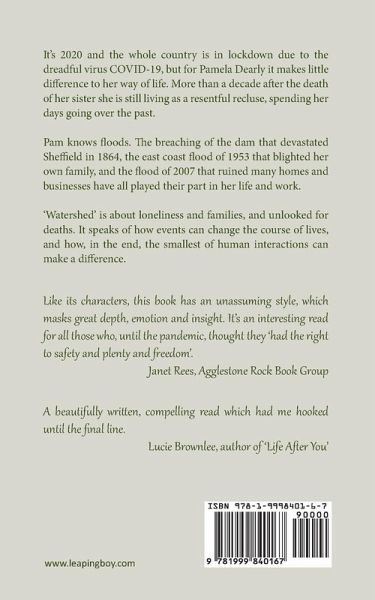 As deaths mount during the coronavirus pandemic a retired history teacher reflects on the much greater personal impact of the death of her sister death 12 years before. Looking through the lens of the lockdown, Pam Dearly looks back on her and her sister Pauline’s childhood, and how their family was affected by the Canvey Island flood of 1953. When they both settle in Sheffield they begin to lead very different lives, Pauline outgoing and sociable, Pam reserved and insular. After Pauline’s death Pam finds herself more involved with her sister’s daughter and grandchildren than she had planned. The Great Sheffield Flood of 1864 resonates with her and she uses it for a local history project for her students, but she is not expecting to find herself and her new family affected by floods themselves, or to be the one who has to find a solution to their problems. ‘Watershed’ is about loneliness and families, and unlooked for deaths. It speaks of how events can change the course of lives, and how, in the end, the smallest of human interactions can make a difference. Susan Day skilfully conveys the many and complex manifestations of grief; how it affects people so differently, how pervasive and long-lasting its reach really is. There are no tidy endings here, no happy ever-afters – just an acceptance that life does and must go on.