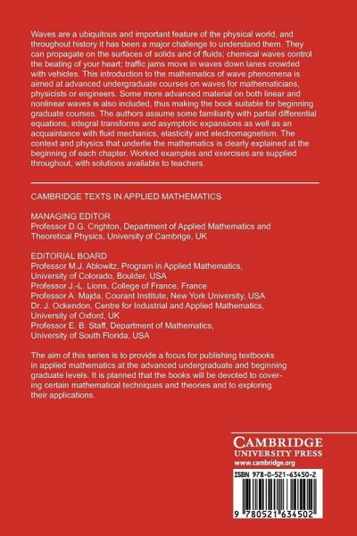 Waves are a ubiquitous and important feature of the physical world, and throughout history it has been a major challenge to understand them. They can propagate on the surfaces of solids and of fluids; chemical waves control the beating of your heart; traffic jams move in waves down lanes crowded with vehicles. This introduction to the mathematics of wave phenomena is aimed at advanced undergraduate courses on waves for mathematicians, physicists or engineers. Some more advanced material on both linear and nonlinear waves is also included, thus making the book suitable for beginning graduate courses. The authors assume some familiarity with partial differential equations, integral transforms and asymptotic expansions as well as an acquaintance with fluid mechanics, elasticity and electromagnetism. The context and physics that underlie the mathematics is clearly explained at the beginning of each chapter. Worked examples and exercises are supplied throughout, with solutions available to teachers.