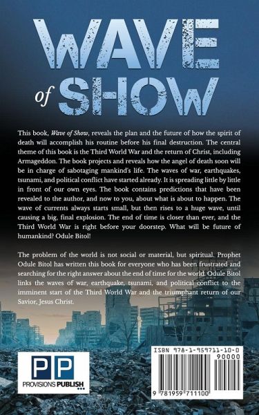 This book, Wave of Show, reveals the plan and the future of how the spirit of death will accomplish his routine be before his final destruction. The central theme of this book is the Third World War and the return of Christ, including Armageddon. The book projects and reveals how the angel of death soon will be in charge of sabotaging mankind's life. The waves of war, earthquakes, tsunami, and political conflict have started already. It is spreading little by little in front of our own eyes. The book contains predictions that have been revealed to the author, and now to you, about what is about to happen. The wave of currents always starts small, but then rises to a huge wave, until causing a big, final explosion. The end of time is closer than ever, and the Third World War is right before your doorstep. What will be future of humankind?The problem of the world is not social or material, but spiritual. Prophet Odule Bitol has written this book for everyone who has been frustrated and searching for the right answer about the end of time for the world. Odule Bitol links the waves of war, earthquake, tsunami, and political conflict to the imminent start of the Third World War and the triumphant return of our Savior, Jesus Christ.