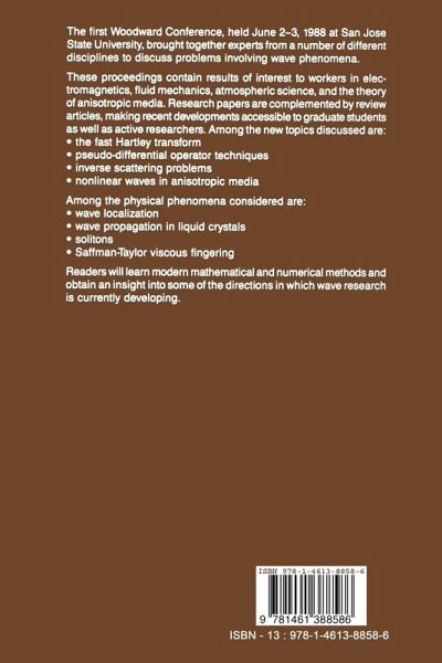 IJ:1 June of 1987 the Center for Applied Mathematics and Computer Science at San Jose State University received a bequest of over half a million dollars from the estate of Mrs. Marie Woodward. In the opening article of this collection of papers Jane Day, the founder of the Center, describes the background that led to this gift. In recognition of the bequest it was decided that a series of Woodward Conferences be established. The First Woodward Conference took place at San Jose State University on June 2-3 1988. The themes of the conference were the Theoretical, Computational and Practical Aspects of Wave Phenomena and these same themes have been used to divide the contributions to this volume. Part I is concerned with papers on theoretical aspects. This section includes papers on pseudo-differential operator techniques, inverse problems and the mathematical foundations of wave propagation in random media. Part II consists of papers that involve significant amounts of computation.Included are papers on the Fast Hartley Transform, computational algorithms for electromagnetic scattering problems, and nonlinear wave interaction problems in fluid mechanics. vi Part III contains papers with a genuine physics flavor. This final section illustrates the widespread importance of wave phenomena in physics. Among the phenomena considered are waves in the atmosphere, viscous fingering in liquid crystals, solitons and wave localization.
