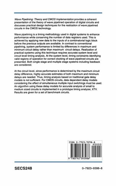 The quest for higher performance digital systems for applications such as gen eral purpose computing, signal/image processing, and telecommunications and an increasing cost consciousness have led to a major thrust for high speed VLSI systems implemented in inexpensive and widely available technologies such as CMOS. This monograph, based on the first author's doctoral dissertation, con centrates on the technique of wave pipelining as one method toward achieving this goal. The primary focus of this monograph is to provide a coherent pre sentation of the theory of wave pipelined operation of digital circuits and to discuss practical design techniques for the realization of wave pipelined circuits in the CMOS technology. Wave pipelining can be applied to a variety of cir cuits for increased performance. For example, many architectures that support systolic computation lend themselves to wave pipelined realization. Also, the wave pipeline design methodology emphasizes the role of controlled clock skew in extracting enhanced performance from circuits that are not deeply pipelined. Wave pipelining (also known as maximal rate pipelining) is a timing method ology used in digital systems to increase the number of effective pipeline stages without increasing the number of physical registers in the pipeline. Using this technique, new data is applied to the inputs of a combinational logic block be fore the outputs due to previous inputs are available thus effectively pipelining the combinational logic and maximizing the utilization of the logic.