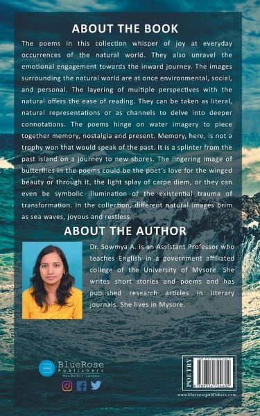 The poems in this collection whisper of joy at everyday occurrences of the natural world. They also unravel the emotional engagement towards the inward journey. The images surrounding the natural world are at once environmental, social, and personal. The layering of multiple perspectives with the natural offers the ease of reading. They can be taken as literal, natural representations or as channels to delve into deeper connotations. The poems hinge on water imagery to piece together memory, nostalgia and present. Memory, here, is not a trophy won that would speak of the past. It is a splinter from the past island on a journey to new shores. The lingering image of butterflies in the poems could be the poet's love for the winged beauty or through it, the light splay of carpe diem, or they can even be symbolic illumination of the existential trauma of transformation. In the collection, different natural images brim as sea waves, joyous and restless.