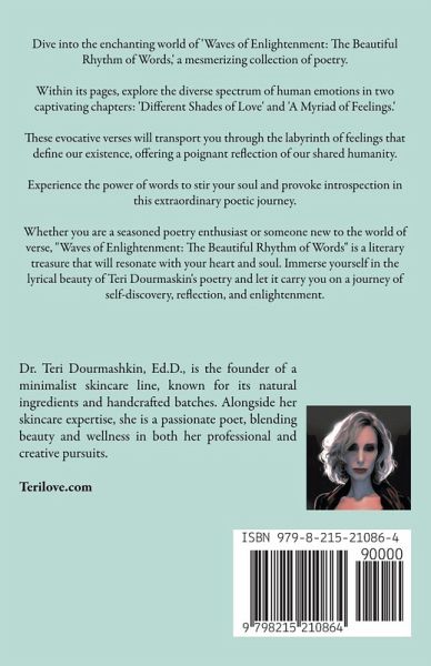 Dive into the enchanting world of 'Waves of Enlightenment: The Beautiful Rhythm of Words,' a mesmerizing collection of poetry. Within its pages, explore the diverse spectrum of human emotions in two captivating chapters: 'Different Shades of Love' and 'A Myriad of Feelings.' These evocative verses will transport you through the labyrinth of feelings that define our existence, offering a poignant reflection of our shared humanity. Experience the power of words to stir your soul and provoke introspection in this extraordinary poetic journey. Whether you are a seasoned poetry enthusiast or someone new to the world of verse, "Waves of Enlightenment: The Beautiful Rhythm of Words" is a literary treasure that will resonate with your heart and soul. Immerse yourself in the lyrical beauty of Teri Dourmaskin's poetry and let it carry you on a journey of self-discovery, reflection, and enlightenment.