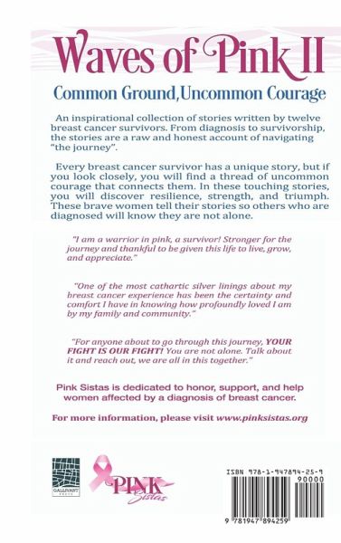 Imagine hearing the words, "You have breast cancer." In Waves of Pink II: Common Ground, Uncommon Courage, twelve breast cancer survivors tell their inspirational stories. From diagnosis to survivorship, the stories are a raw and honest account of navigating "the journey". Each chapter gives you a first-hand look into real-life stories of personal heartbreak and resilience. Waves of Pink II: Common Ground, Uncommon Courage reveals the complexity of a breast cancer diagnosis and subsequent treatments combined with the reality of patients left to navigate unfamiliar territory on their own. Captivating, engrossing, with authentic vulnerability and matter-of-fact honesty. Common Ground, Uncommon Courage will give you a new perspective into the very personal fight against breast cancer. If you, or someone you know, have breast cancer, you will want to read these beautiful stories of hope. Each purchase helps support Pink Sistas, Inc., a non-profit organization providing no-cost retreats for women diagnosed with breast cancer.