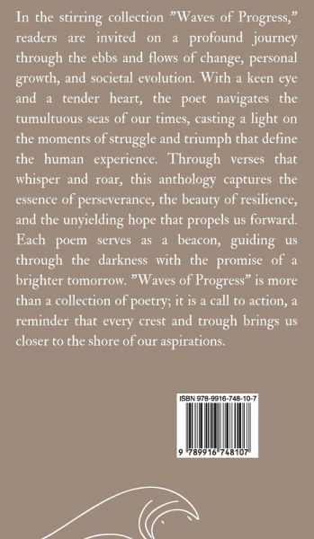 In the stirring collection "Waves of Progress," readers are invited on a profound journey through the ebbs and flows of change, personal growth, and societal evolution. With a keen eye and a tender heart, the poet navigates the tumultuous seas of our times, casting a light on the moments of struggle and triumph that define the human experience. Through verses that whisper and roar, this anthology captures the essence of perseverance, the beauty of resilience, and the unyielding hope that propels us forward. Each poem serves as a beacon, guiding us through the darkness with the promise of a brighter tomorrow. "Waves of Progress" is more than a collection of poetry; it is a call to action, a reminder that every crest and trough brings us closer to the shore of our aspirations. Copyright © 2024 Book Fairy Publishing