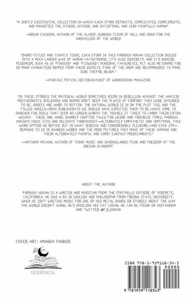 "A subtly existential collection in which each story defracts, complicates, compliments, and magnifies the others. Intense and satisfying, and very painfully human" -Brian Evenson, author of The Glassy, Burning Floor of Hell and Song for the Unraveling of the World "Short-titled and tightly tense, each story in this Padraig Hogan collection builds into a much larger Wax of human catastrophe. It's also sincerity, and it's sincere pessimism, such as in "Fingers" and "Flowers"; personal favourites, yet also metonyms for so many characters ripped from their sockets. Fans of the grim are recommended to make sure they're ready." -Pascale Potvin, Editor-in-Chief of Wrongdoing Magazine "In these stories the material world sometimes seems in rebellion against the hapless protagonists. Buildings and rooms don't seem the places of comfort they were intended to be. Shirts are hard to button. The natural world is in on the plot too, and the fallen angels-smug bureaucrats we should have expected them to be-have come to bargain for souls that seem no longer worth the trouble it takes to carry their extra weight. These are hard, sharply crafted tales for weird and troubled times. Padraig Hogan's voice cuts and delights throughout-alternately empathetic and unpitying, this work offers no refuge but in what serious and considerable pleasure-and even joy-remains to us in sharing words and the mind pictures they make of these humans and their alternately painful and comic earthly predicaments." -Anthony McCann, author of Thing Music and Shadowlands: Fear and Freedom at the Oregon Standoff