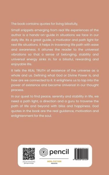 The book contains quotes for living blissfully, Small snippets emerging from real life experiences of the author is a hands-on-guide in situations we face in our daily life. Its a great guide, a motivator and path light for real life situations. It helps in traversing life path with ease and awareness. It attunes the reader to the universal vibrations so that a sense of belonging, stability and universal energy sinks in. for a blissful, rewarding and enjoyable life. It tells the REAL TRUTH of existence of the universe as a whole and us. Defining what God or Divine Power is, and how are we connected to it. It enlightens us to tap into the power of existence and become Universal in our thought process. In our quest to find peace, serenity and stability in life, we need a path light, a direction and a guru to traverse the path of life and beyond with bliss and happiness. God quotes in the book are the real guidance, motivation and enlightenment for the soul.