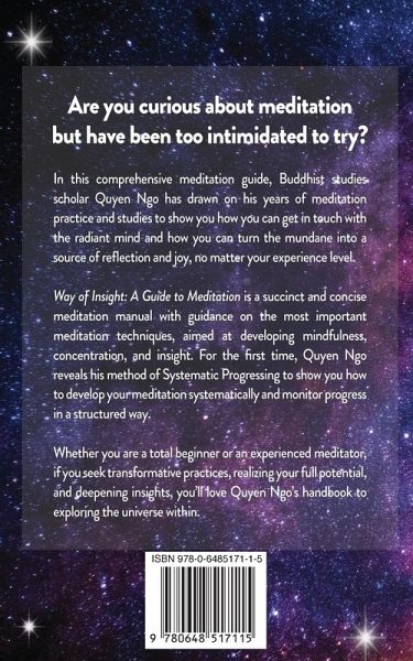 Are you curious about meditation but have been too intimidated to try?In this comprehensive meditation guide, Buddhist studies scholar Quyen Ngo has drawn on his years of meditation practice and studies to show you how you can get in touch with the radiant mind and how you can turn the mundane into a source of reflection and joy, no matter your experience level.Way of Insight: A Guide to Meditation is a succinct and concise meditation manual with guidance on the most important meditation techniques aimed at developing mindfulness, concentration, and insight. For the first time, Quyen Ngo reveals his method of Systematic Progressing to show you how to develop your meditation systematically and monitor progress in a structured way.Whether you are a total beginner or an experienced meditator, if you seek transformative practices, realizing your full potential, and deepening insights, you'll love Quyen Ngo's handbook to exploring the universe within.