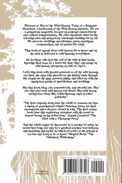 Way of the Wild Human is a guidebook on all things wild human. It's a compilation of essays about wild human life at home and on the road. This book is the first of a series being published by the Wild Human Initiative, a grassroots nonprofit focused on rewilding, community building, neotribalism, green anarchism, nomadism, and all related topics. We provide charitable relief for the traveling poor, and we advocate grassroots community building for us all. This book empowers the readers to activate wild humanism in their own lives, and to help manifest change in society at large.