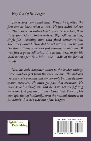 The wolves came that day. When he spotted the first one he knew what it was. He just didn't believe it. There were no wolves here! Then he saw two, then three, four. Gray Timber wolves. Big. All pacing him, single-file, watching him with fixed concentration. Then they lunged. How did he get into this mess? Jim Goodman thought he was just sharing an opinion. It was just a guest editorial. It was just written for his local newspaper. Now he’s in the middle of the fight of his life. Now his only daughter clings to the bridge railing, three hundred feet from the rocks below. The hideous beast between him and her can only be some demon-spawn creature. He must get past that creature. He must save his daughter. But he is no demon-fighting warrior! He’s just an ordinary Christian! Even so, his own life, that of his family, even the nation’s future is in his hands. But he’s way out of his league!