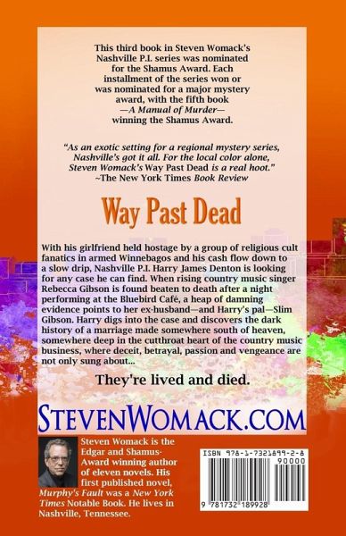 With his girlfriend held hostage by a group of cult religious fanatics in armed Winnebagos and his cash flow down to a slow drip, Nashville P.I. Harry James Denton is looking for any case he can find. When rising country music singer Rebecca Gibson is found beaten to death, a heap of damning evidence points to her ex-husband—and Harry's pal—Slim Gibson. Harry digs into the case and discovers the dark history of a marriage made somewhere south of Heaven, somewhere deep in the cutthroat heart of the country music business, where deceit, betrayal, passion and vengeance are not only sung about... they're lived and died. The third installment of award-winning author Steven Womack’s Nashville P.I. series, Way Past Dead was nominated for the PWA Shamus Award.