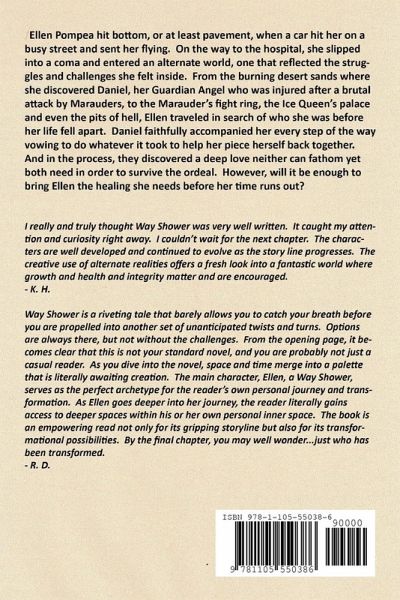 Ellen Pompea hit bottom, or at least pavement, when a car hit her on a busy street and sent her flying. On the way to the hospital, she slipped into a coma and entered an alternate world, one that reflected the struggles and challenges she felt inside. From the burning desert sands where she discovered Daniel, her Guardian Angel injured from a brutal attack by Marauders, to the Marauder's fight ring, the Ice Queen's palace and even the pits of hell, Ellen travels in search of who she was before her life fell apart. Daniel faithfully accompanies her every step of the way vowing to do whatever it takes to help her piece herself back together. And in the process, they discover a deep love neither can fathom yet both need in order to survive the ordeal. However, will it be enough to bring Ellen the healing she needs before her time runs out?