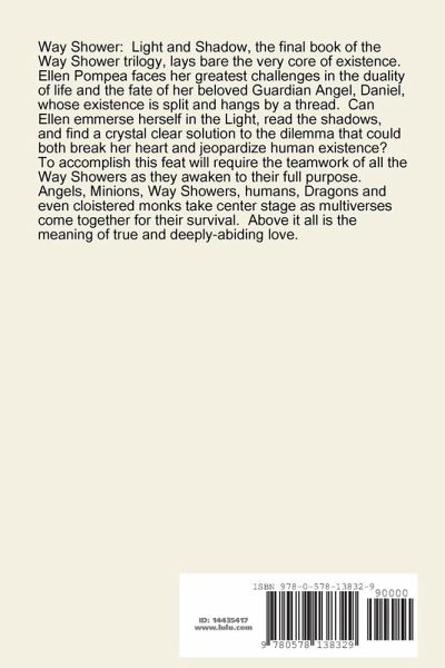 Way Shower: Light and Shadow, the final book of the Way Shower trilogy, lays bare the very core of existence. Ellen Pompea faces her greatest challenges in the duality of life and the fate of her beloved Guardian Angel, Daniel, whose existence is split and hangs by a thread. Can Ellen emmerse herself in the Light, read the shadows, and find a crystal clear solution to the dilemma that could both break her heart and jeopardize human existence? To accomplish this feat will require the teamwork of all the Way Showers as they awaken to their full purpose. Angels, Minions, Way Showers, humans, Dragons and even cloistered monks take center stage as multiverses come together for survival. Above it all is the meaning of true and deeply-abiding love.