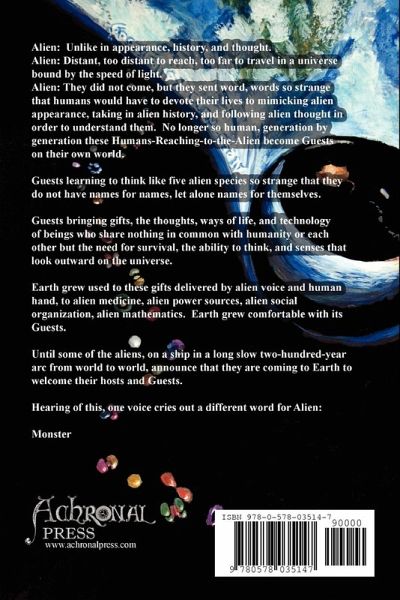 Alien: Unlike in appearance, history, and thought. Alien: Distant, too distant to reach, too far to travel in a universe bound by the speed of light. Alien: They did not come, but they sent word, words so strange that humans would have to devote their lives to mimicking alien appearance, taking in alien history, and following alien thought in order to understand them. No longer so human, generation by generation these Humans-Reaching-to-the-Alien become Guests on their own world. Until some of the aliens, on a ship in a long slow two-hundred-year arc from world to world, announce that they are coming to Earth to welcome their hosts and Guests. Hearing of this, one voice cries out a different word for Alien: Monster