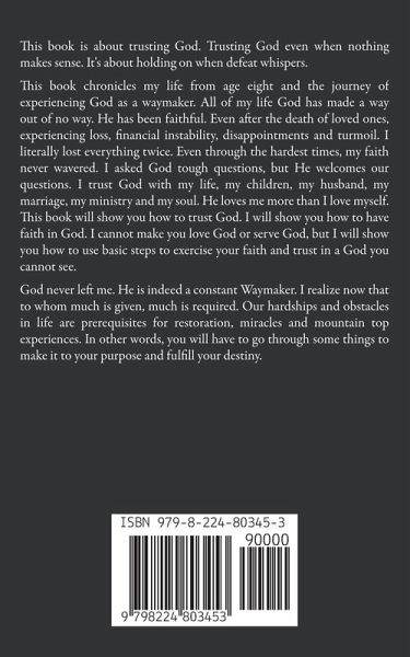 This book is about trusting God. Trusting God even when nothing makes sense. It's about holding on when defeat whispers. This book chronicles my life from age eight and the journey of experiencing God as a waymaker. All of my life God has made a way out of no way. He has been faithful. Even after the death of loved ones, experiencing loss, financial instability, disappointments and turmoil. I literally lost everything twice. Even through the hardest times, my faith never wavered. I asked God tough questions, but He welcomes our questions. I trust God with my life, my children, my husband, my marriage, my ministry and my soul. He loves me more than I love myself. This book will show you how to trust God. I will show you how to have faith in God. I cannot make you love God or serve God, but I will show you how to use basic steps to exercise your faith and trust in a God you cannot see. God never left me. He is indeed a constant Waymaker. I realize now that to whom much is given, much is required. Our hardships and obstacles in life are prerequisites for restoration, miracles and mountain top experiences. In other words, you will have to go through some things to make it to your purpose and fulfill your destiny.