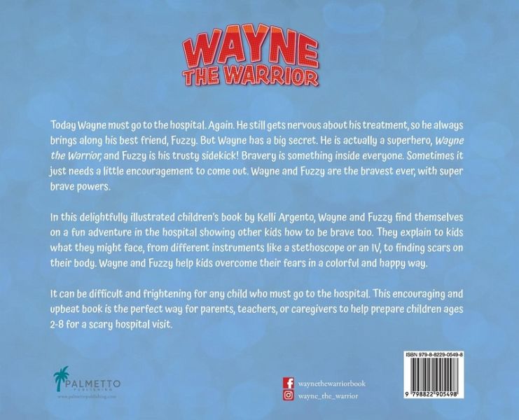 Bravery is something inside everyone. Sometimes it just needs a little encouragement to come out. Today Wayne must go to the hospital. Again. He still gets nervous about his treatment, so he always brings along his best friend, Fuzzy. But Wayne has a big secret. He is actually a superhero, Wayne the Warrior, and Fuzzy is his trusty sidekick! In this delightfully illustrated children's book by Kelli Argento, Wayne and Fuzzy are on a fun adventure in the hospital showing other kids how to be brave too. They explain to kids what they might face, from different instruments like a stethoscope or an IV, to finding scars on their body. Wayne and Fuzzy help kids overcome their fears in a colorful and happy way. This encouraging and upbeat book is the perfect way for parents, teachers, or caregivers to help prepare children ages 2-8 for a scary hospital visit.
