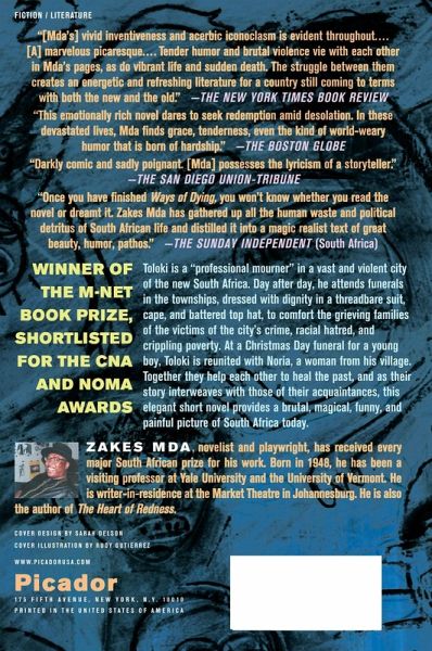 Winner of the M-Net Book Prize Shortlisted for the CNA and Noma Awards In Ways of Dying, Zakes Mda's acclaimed first novel, Toloki is a "professional mourner" in a vast and violent city of the new South Africa. Day after day he attends funerals in the townships, dressed with dignity in a threadbare suit, cape, and battered top hat, to comfort the grieving families of the victims of the city's crime, racial hatred, and crippling poverty. At a Christmas day funeral for a young boy Toloki is reunited with Noria, a woman from his village. Together they help each other to heal the past, and as their story interweaves with those of their acquaintances this elegant short novel provides a magical and painful picture of South Africa today. Ways of Dying was awarded South Africa's prestigious M-Net Book Prize, awarded by the TV channel M-Net to books written in one of South Africa's official languages, and was shortlisted for the Central News Agency (CNA) Award and the Noma Award, an Africa-wide prize founded by Shoichi Noma, onetime president of Kodansha International.