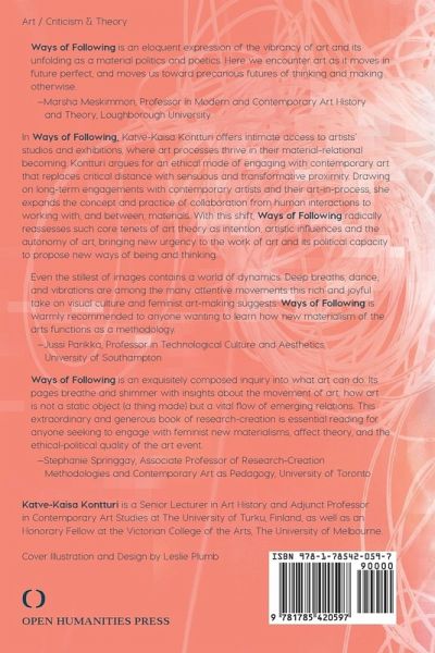 In Ways of Following, Katve-Kaisa Kontturi offers rare, intimate access to artists’ studios and exhibitions, where art processes thrive in their material-relational becoming. The book argues for an ethical and affirmative mode of engaging with contemporary art that replaces critical distance with sensuous and transformative proximity. From writing-with to dancing and breathing, from conversations to modelling, Kontturi maps ways of following that make the moving materiality of art intensively felt. Drawing on long-term engagements with selected contemporary artists and their art-in-process, Kontturi expands the concept and practice of collaboration from human interactions to working with, and between, materials. With this shift, Ways of Following radically rethinks such core tenets of art theory as intention, artistic influences and the autonomy of art, bringing new urgency to the work of art and its political capacity to propose new ways of being and thinking.