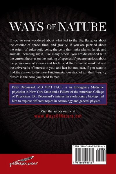 In Ways of Nature, Dr. Décossard articulates the first theory of evolution since Darwin. By his own account, he stumbled upon his proposed mechanism of eukaryogenesis using a process worthy of the three princes of Serendip. From there, he succeeded in establishing a comprehensive theory of life and the universe. For instance, we learn that a new paradigm, called " the seeds-first theory," explains biodiversity among eukaryotes. It is interesting to find out what contributions, if any, the theory of natural selection has made to the new model. Nevertheless, neo-Darwinism - the modern version of Darwinism - has long been engaged in a major antagonism with the theory of Intelligent Design (ID), which holds that the living world emanated from the conscious choice of a designer rather than chance events. In any case, the author will be the first one to admit that the new model of evolution delineated in this opus is not born out of the crisis that is currently rocking neo-Darwinism, a crisis sparked by the assaults of many thinkers and scientists, including those of the ID movement. He is also quick to reveal how little he knew about the standoff between the two main protagonists in the crisis of natural selection theory before he began work on this book, cloistered as he was, both literally and figuratively, within the confines of emergency rooms caring for the sick and injured. In Ways of Nature, Dr. Décossard explores the paths taken by life since its apparition and shines a bright spotlight on its destiny and the fate of the universe. In so doing, he also identifies the connections between the living and the nonliving and opens our eyes to novel ideas about physical phenomena whose conventional descriptions we thought were settled. Ways of Nature is undoubtedly a landmark publication. It is indeed a paradigm shift à la Kuhn in our understanding of life and its evolution.