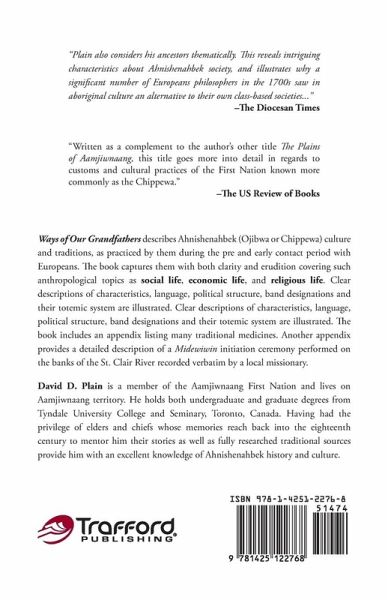 Ways of Our Grandfathers compliments David D Plain's previous book, The Plains of Aamjiwnaang. While his first book focused on the history of the Ahnishenahbek (Chippewa) of Aamjiwnaang territory Ways of Our Grandfathers describes Ahnishenahbek culture and traditions from the pre and early contact period with Europeans. It covers such anthropological topics as social life, economic life, and religious life. Clear descriptions of characteristics, language, political structure, band designations and their totemic system are illustrated. Gatherings, games and stories are depicted with vivid illustrations. Construction of their dwellings and canoes are described as well as methods of hunting, fishing and sugar making. Trade routes and places of trade are given as well as types of trade goods. Religious life is detailed and includes a description of the political structure of the Midéwiwin Medicine Society, healing practices and death customs. The book includes an appendix listing many traditional medicines. Another appendix provides a detailed description of a Midéwiwin initiation ceremony performed on the banks of the St. Clair River recorded verbatim by a local missionary.