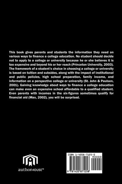This book gives parents and students the information they need on various ways to finance a college education. No student should decide not to apply to a college or university because he or she believes it is too expensive and beyond his or her reach (Princeton University, 2003). The framework of a student's choice in choosing a college or university is based on tuition and subsides, along with the impact of institutional and public policies, high school preparation, family income, and information on a perspective college or university (St. John and Paulsen, 2001). Gaining knowledge about ways to finance a college education can make even an expensive school affordable to a qualified student. Even parents with incomes in the six-figures sometimes qualify for financial aid (Max, 2002), you will be surprised.