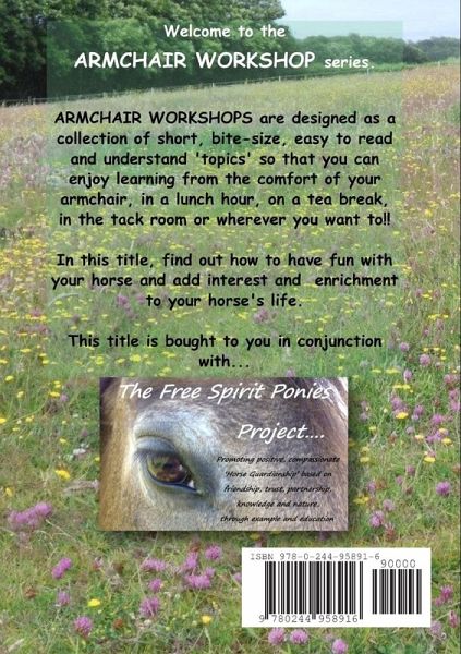 ARMCHAIR WORKSHOPS are designed as a collection of short, bite-size, easy to read and understand 'topics' so that you can enjoy learning from the comfort of your armchair, in a lunch hour, on a tea break, in the tack room or wherever you want to!! In this title, find out how to have fun with your horse and add interest and enrichment to your horse's life.