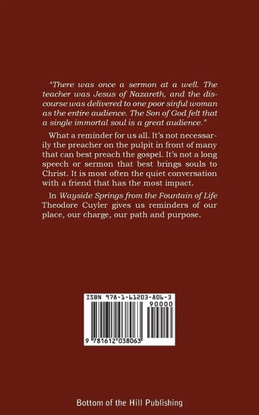 "There was once a sermon at a well. The teacher was Jesus of Nazareth, and the discourse was delivered to one poor sinful woman as the entire audience. The Son of God felt that a single immortal soul is a great audience." What a reminder for us all. It's not necessarily the preacher on the pulpit in front of many that can best preach the gospel. It's not a long speech or sermon that best brings souls to Christ. It is most often the quiet conversation with a friend that has the most impact. In Wayside Springs from the Fountain of Life Theodore Cuyler gives us reminders of our place, our charge, our path and purpose.