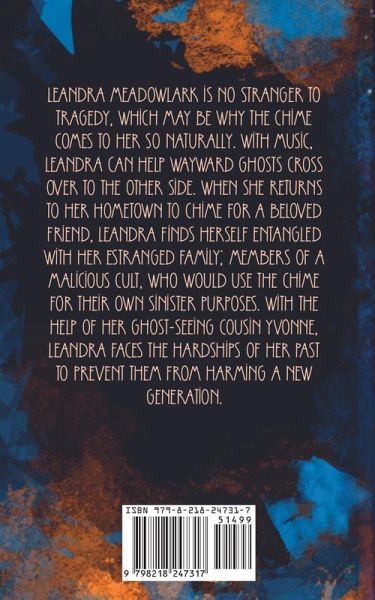 Leandra Meadowlark is no stranger to tragedy, which may be why The Chime comes to her so naturally. With music, Leandra can help wayward ghosts cross over to the other side. When she returns to her hometown to Chime for a beloved friend, Leandra finds herself entangled with her estranged family; members of a malicious cult, who would use the Chime for their own sinister purposes. With the help of her ghost-seeing cousin Yvonne, Leandra faces the hardships of her past to prevent them from harming a new generation.