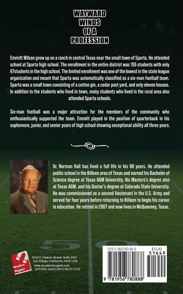 Emmitee Wilson Grew up on a ranch in central Texas near the Village of Sparta. He attended school at Sparta High School. The enrollment was some 155 students with only 57 students in high school. This limited enrollment placed the high school in the lowest classification of sports taking part in the state league organization. Sparta was assigned to the six men football organization. Sparta was only a small village consisting of a cotton gin, a cedar post yard, the school, and eleven houses making up the village population. In addition, to the students coming from the village the balance coming from the rural area of the district. Six-man football was the main attraction of the community life in the district. The village and community supported the football team with exaggerated enthusiasm and spirit. Emmitee served as the quarterback during his sophomore, junior, and senior years of high school. His passing ability set him apart as an outstanding athlete in the six-man football league.
