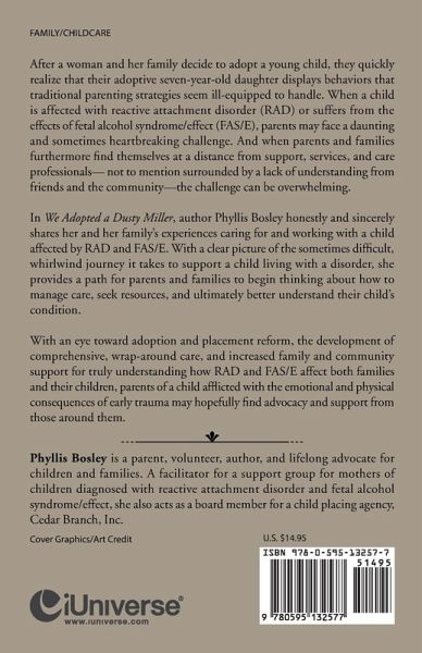 After a woman and her family decide to adopt a young child, they quickly realize that their adoptive seven-year-old daughter displays behaviors that traditional parenting strategies seem ill-equipped to handle. When a child is affected with reactive attachment disorder (RAD) or suffers from the effects of fetal alcohol syndrome/effect (FAS/E), parents may face a daunting and sometimes heartbreaking challenge. And when parents and families furthermore find themselves at a distance from support, services, and care professionals¿ not to mention surrounded by a lack of understanding from friends and the community¿the challenge can be overwhelming. In We Adopted a Dusty Miller, author Phyllis Bosley honestly and sincerely shares her and her family¿s experiences caring for and working with a child affected by RAD and FAS/E. With a clear picture of the sometimes difficult, whirlwind journey it takes to support a child living with a disorder, she provides a path for parents and families to begin thinking about how to manage care, seek resources, and ultimately better understand their child¿s condition. With an eye toward adoption and placement reform, the development of comprehensive, wrap-around care, and increased family and community support for truly understanding how RAD and FAS/E affect both families and their children, parents of a child afflicted with the emotional and physical consequences of early trauma may hopefully find advocacy and support from those around them.