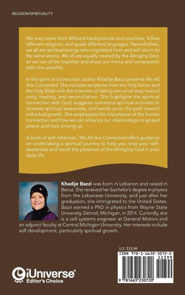 We may come from different backgrounds and countries, follow different religions, and speak different languages. Nevertheless, we all are spiritual beings who originated from and will return to the same source. We all are equally created by the Almighty God, so we can all be together and share our mercy and compassion with one another. In the spirit of connection, author Khadije Bazzi presents We All Are Connected. She includes scriptures from the Holy Qur'an and the Holy Bible with the intention of taking one small step toward unity, healing, and reconciliation. She highlights the spiritual connection with God, suggests numerous spiritual activities to increase spiritual awareness, and sends us on the path toward individual growth. She emphasizes the importance of the human connection and how we can enhance our relationships to spread peace and love among us. A book of self-reflection, We All Are Connected offers guidance on undertaking a spiritual journey to help you raise your self-awareness and touch the presence of the Almighty God in your daily life.