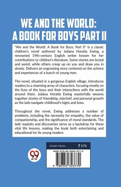 "We and the World: A Book for Boys. Part II" is a classic children's novel authored by Juliana Horatia Ewing, a renowned 19th-century English writer known for her contributions to children's literature. Some stories are brutal and weird, while others creep up on you and draw you in slowly. Delivers an engrossing story centered on the actions and experiences of a bunch of young men. The novel, situated in a gorgeous English village, introduces readers to a charming array of characters, focusing mostly on the lives of the boys and their interactions with the world around them. Juliana Horatia Ewing masterfully weaves together stories of friendship, mischief, and personal growth as the lads navigate childhood's highs and lows. Throughout the novel, Ewing addresses a number of problems, including the necessity for empathy, the value of companionship, and the significance of moral standards. The lads' exploits and discoveries serve as a backdrop for these vital life lessons, making the book both entertaining and educational for its young readers.