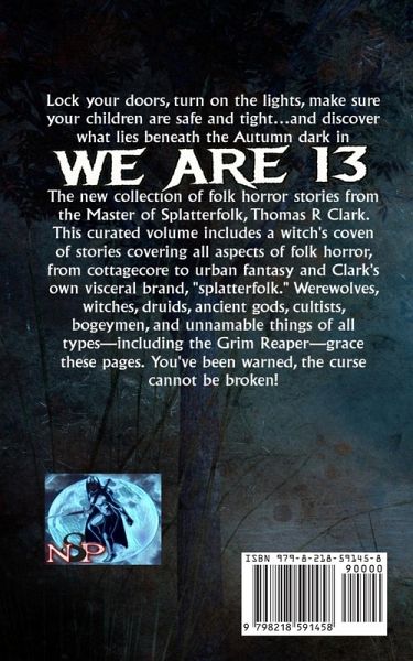 Lock your doors, turn on the lights, and make sure your children are safe and tight...and discover what lies beneath the Autumn dark in WE ARE 13... The new collection of folk horror stories from the Master of Splatterfolk, Thomas R Clark. This curated volume includes a witch's coven of stories covering all aspects of folk horror, from cottagecore to urban fantasy. Werewolves, witches, druids, ancient gods, bogeymen, and unnamable things of all types grace these pages. You've been warned, the curse cannot be broken!