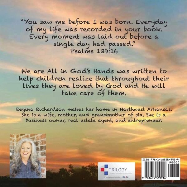 "You saw me before I was born. Everyday of my life was recorded in your book. Every moment was laid out before a single day had passed."Psalms 139:16 We are All in God's Hands was written to help children realize that throughout their lives they are loved by God and He will take care of them.