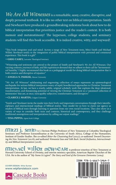 We Are All Witnesses is a remarkable, sassy, creative, disruptive, and deeply personal textbook. It is like no other text on biblical interpretation. Smith and Newheart have produced a groundbreaking milestone book about how to do biblical interpretation that prioritizes justice and the reader's context. It is both memoir and metatestimony! The layperson, college students, and seminary students will find this book accessible. It is indeed creative, witty, and wayward!