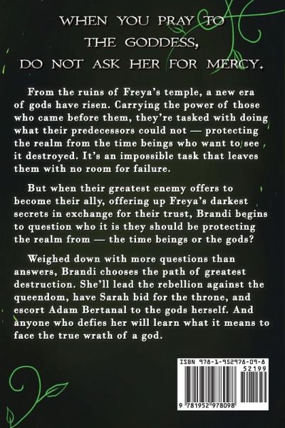 From the ruins of Freya's temple, a new era of gods have risen. Carrying the power of those who came before them, they're tasked with doing what their predecessors could not - protecting the realm from the time beings who want to see it destroyed. It's an impossible task that leaves them with no room for failure.But when their greatest enemy offers to become their ally, offering up Freya's darkest secrets in exchange for their trust, Brandi begins to question who it is they should be protecting the realm from - the time beings or the gods?Weighed down with more questions than answers, Brandi chooses the path of greatest destruction. She'll lead the rebellion against the queendom, have Sarah bid for the throne, and escort Adam Bertanal to the gods herself. And anyone who defies her will learn what it means to face the true wrath of a god.