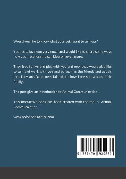 Would you like to know what your pets want to say to you ? Your pets love you very much and would like to share some ways how your relationship can improve even more. They love to play and live with you and now they would also like to talk and work with you and be seen as the friends and equals that they are. This book has been created with the tool of Animal Communication. www.voice-for-nature.com