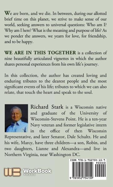 We are born, and we die. In between, during our allotted brief time on this planet, we strive to make sense of our world, seeking answers to universal questions: Who am I? Why am I here? What is the meaning and purpose of life? As we ponder the answers, we yearn for love, for friendship, and to be happy. WE ARE IN THIS TOGETHER is a collection of nine beautifully articulated vignettes in which the author shares personal experiences from his own life's journey. In this collection, the author has created loving and enduring tributes to the dearest people and the most significant events of his life; tributes to which we can also relate, that touch the heart and speak to the soul.