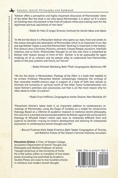 How should Jews see themselves and see others-as united by common humanity and purpose, or divided by something inherent? We Are Not Alone grounds a universalist vision of Judaism in texts and teachings of the tradition, especially those of Maimonides.