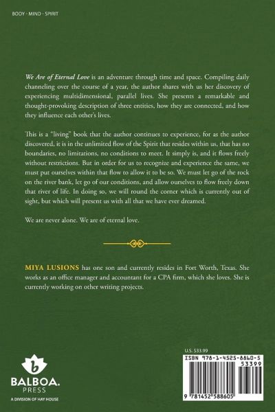 We Are of Eternal Love is an adventure through time and space. Compiling daily channeling over the course of a year, the author shares with us her discovery of experiencing multidimensional, parallel lives. She presents a remarkable and thought-provoking description of three entities, how they are connected, and how they influence each other's lives. This is a "living" book that the author continues to experience, for as the author discovered, it is in the unlimited flow of the Spirit that resides within us, that has no boundaries, no limitations, no conditions to meet. It simply is, and it flows freely without restrictions. But in order for us to recognize and experience the same, we must put ourselves within that flow to allow it to be so. We must let go of the rock on the river bank, let go of our conditions, and allow ourselves to flow freely down that river of life. In doing so, we will round the corner which is currently out of sight, but which will present us with all that we have ever dreamed. We are never alone. We are of eternal love.