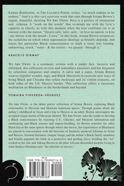 We Are Owed. is the debut poetry collection of Ariana Brown, exploring Black relationality in Mexican and Mexican American spaces. Through poems about the author's childhood in Texas and a trip to Mexico as an adult, Brown interrogates the accepted origin stories of Mexican identity. We Are Owed asks the reader to develop a Black consciousness by rejecting U.S., Chicano, and Mexican nationalism and confronting anti-Black erasure and empire-building. As Brown searches for other Black kin in the same spaces through which she moves, her experiences of Blackness are placed in conversation with the histories of formerly enslaved Africans in Texas and Mexico. Esteban Dorantes, Gaspar Yanga, and the author's Black family members and friends populate the book as a protective and guiding force, building the "we" evoked in the title and linking Brown to all other African-descended peoples living in what Saidiya Hartman calls "the afterlife of slavery."