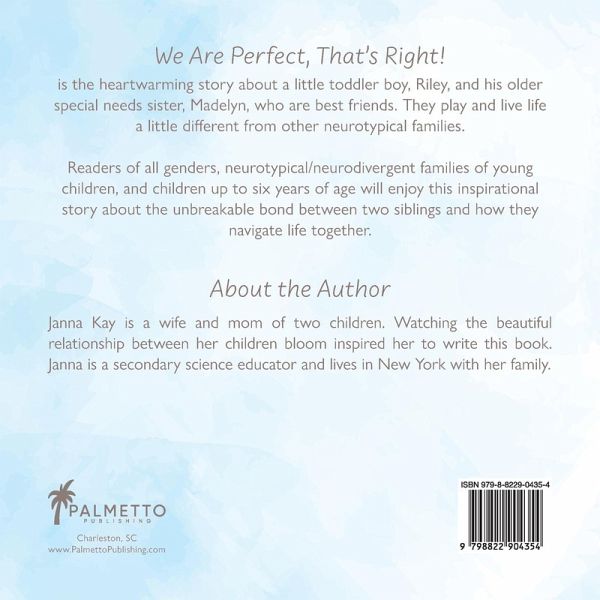 We Are Perfect, That's Right! is the heartwarming story about a little toddler boy, Riley, and his older special needs sister, Madelyn, who are best friends. They play and live life a little different from other neurotypical families. But that only brings them even closer. Madelyn loves looking for the moon. It is something that has always caught her attention since she was a toddler herself. She also has some sensory issues that make life scary for her. For example, loud noises, crowded places, and dentist appointments can really overwhelm her. Riley understands her fears and feelings and guides and calms her through these difficult times. Riley and Madelyn learn from each other. Madelyn as the older sister teaches Riley how to do many things, like how to use the potty, while Riley shows Madelyn how to be brave and that she can rely on him. Through it all, they look out for each other. They share a perfect, special bond that no one else truly understands. Readers of all genders, neurotypical/neurodivergent families of young children, families with one child with a sibling on the way, and children up to six years of age will enjoy and find comfort in this inspirational story about the unbreakable bond between two siblings and how they navigate life together.