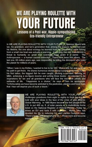 In WE ARE PLAYING ROULETTE WITH YOUR FUTURE G. Spencer Myers tells Ian, his grandson, and Ian's generation that, among the lessons he learned over his lifetime, the one about ecology he learned from his grandfather while fishing from a small row boat was actually a warning. A warning that has evolved into a threat to humanity so great that scientists have given it a name: The Anthropocene --- a human caused extinction. There have been five others. The last one, 65 million years ago, was responsible for killing the dinosaurs who ruled the planet for millions of years. "When I was in my thirties, I wanted to live to be 100," Myers tells Ian and outlines his path to get there. He shares humorous stories about running away from home, his first tattoo, the biggest fish he ever caught, pitching a no-hitter, earning an MBA, achieving a six-figure income and writing three books. All intended to be inspirations for Ian and all grandsons who will face the inevitable pitfalls and setbacks of life. "Happiness is a choice," he says. Then he apologizes, "Unfortunately we have become addicted to the pesticides, plastics and fossil fuels that I fear will deprive you of such a future."