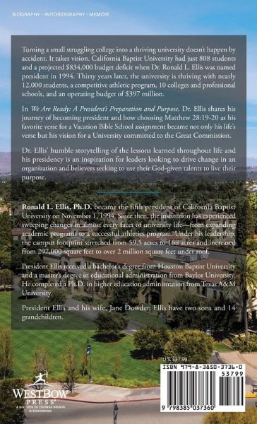 What does it take to turn a struggling Christian college into one of the fastest-growing faith-based universities in the nation? In We Are Ready: A President's Preparation and Purpose, Dr. Ronald L. Ellis reveals the behind-the-scenes journey of transforming California Baptist University from a small institution with just 808 students and a projected $834,000 deficit into a thriving Christian university with nearly 12,000 students, a $397 million budget, and a global impact. Through visionary Christian university leadership and a strategic focus on the Great Commission, Dr. Ellis shares how a childhood Vacation Bible School project based on Matthew 28:19-20 shaped his life's calling and fueled his mission. Part Christian memoir, part roadmap for higher education transformation, this book offers practical wisdom for faith-based education leaders, strategic planners, and believers pursuing personal growth and institutional change. With compelling stories of failure, breakthrough, spiritual clarity, and executive insight, Dr. Ellis delivers a deeply personal narrative rooted in faith and purpose. Whether you're a leader in Christian education, a ministry professional, or a reader inspired by stories of vision and resilience, We Are Ready is your invitation to reflect, lead boldly, and live out your calling with purpose. Join the journey. Discover the power of vision, faith, and readiness.